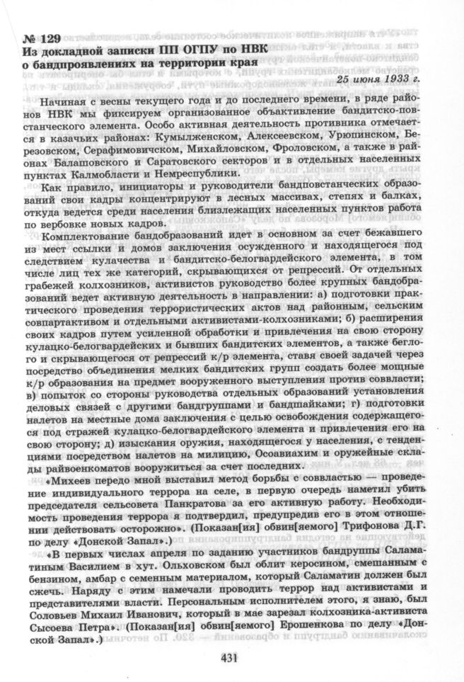 Из докладной записки ПП ОГПУ по НВК о бандпроявлениях на территории края. 25 июня 1933 г. // ЦА ФСБ РФ. Ф. 2. Оп. 11. Д. 880. Л. 86—91. Подлинник.