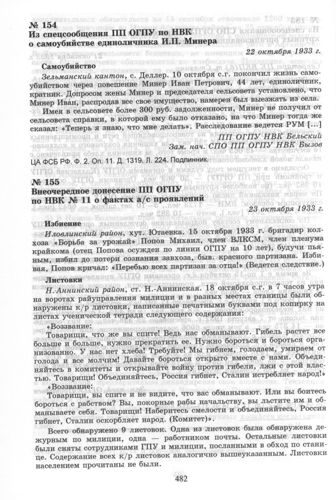 Из спецсообщения ПП ОГПУ по НВК о самоубийстве единоличника И.П. Минера. 22 октября 1933 г. // ЦА ФСБ РФ. Ф. 2. Оп. 11. Д. 1319. Л. 224. Подлинник.