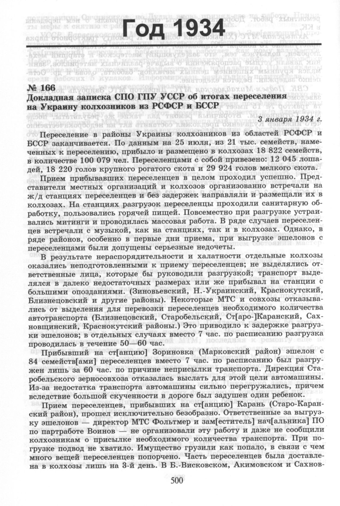 Докладная записка СПО ГПУ УССР об итогах переселения на Украину колхозников из РСФСР и БССР. 3 января 1934 г. // ЦА ФСБ РФ. Ф. 3. Оп. 1. Д. 776. Л. 245—255. Подлинник.