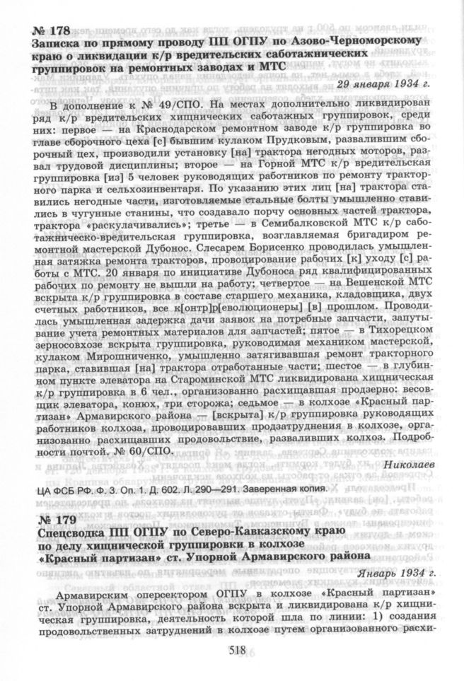 Спецсводка ПП ОГПУ по Северо-Кавказскому краю по делу хищнической группировки в колхозе «Красный партизан» ст. Упорной Армавирского района. Январь 1934 г. // ЦА ФСБ РФ. Ф. 3. Оп. 1. Д. 73. Л. 190—194. Заверенная копия.