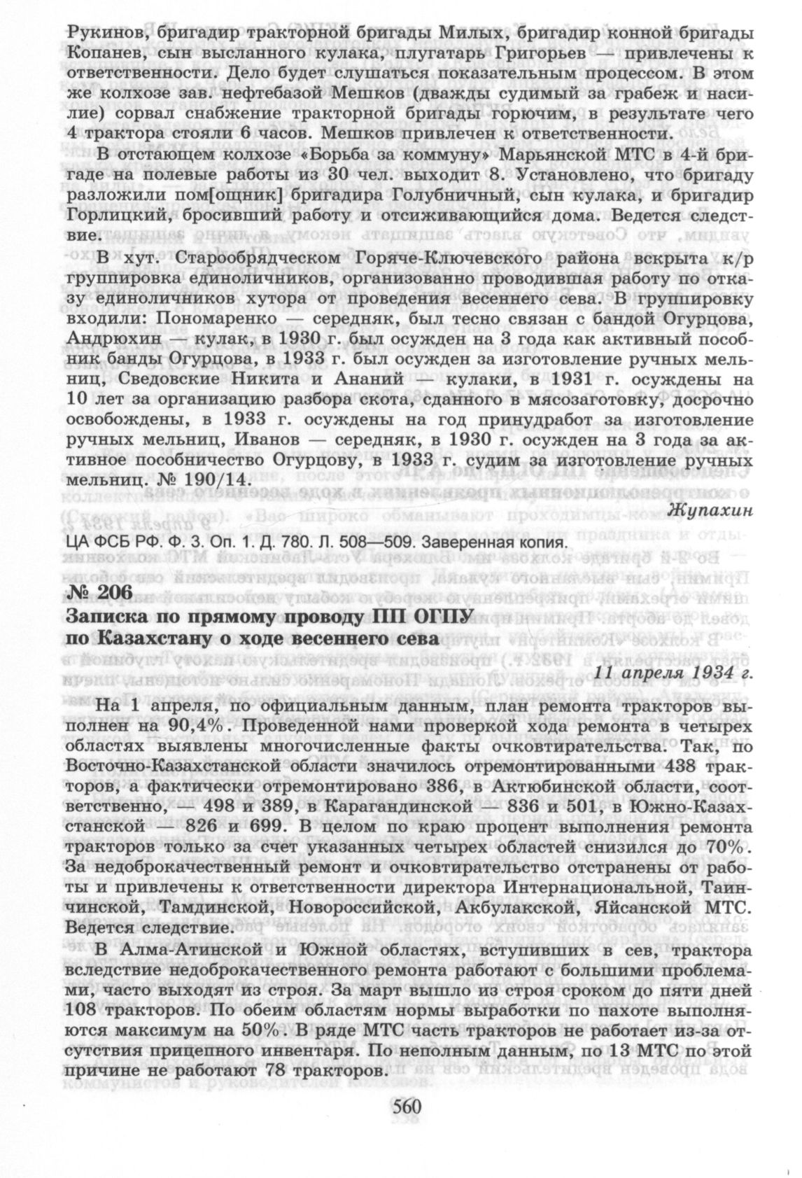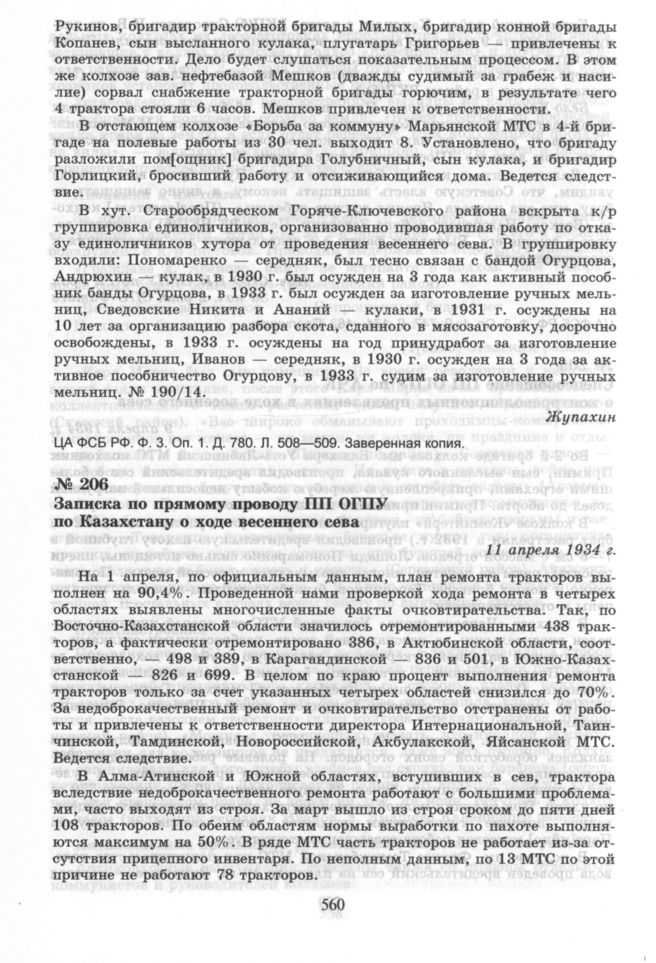 Записка по прямому проводу ПП ОГПУ по Казахстану о ходе весеннего сева. 11 апреля 1934 г. // ЦА ФСБ РФ. Ф. 3. Оп. 1. Д. 780. Л. 482—485. Заверенная копия.