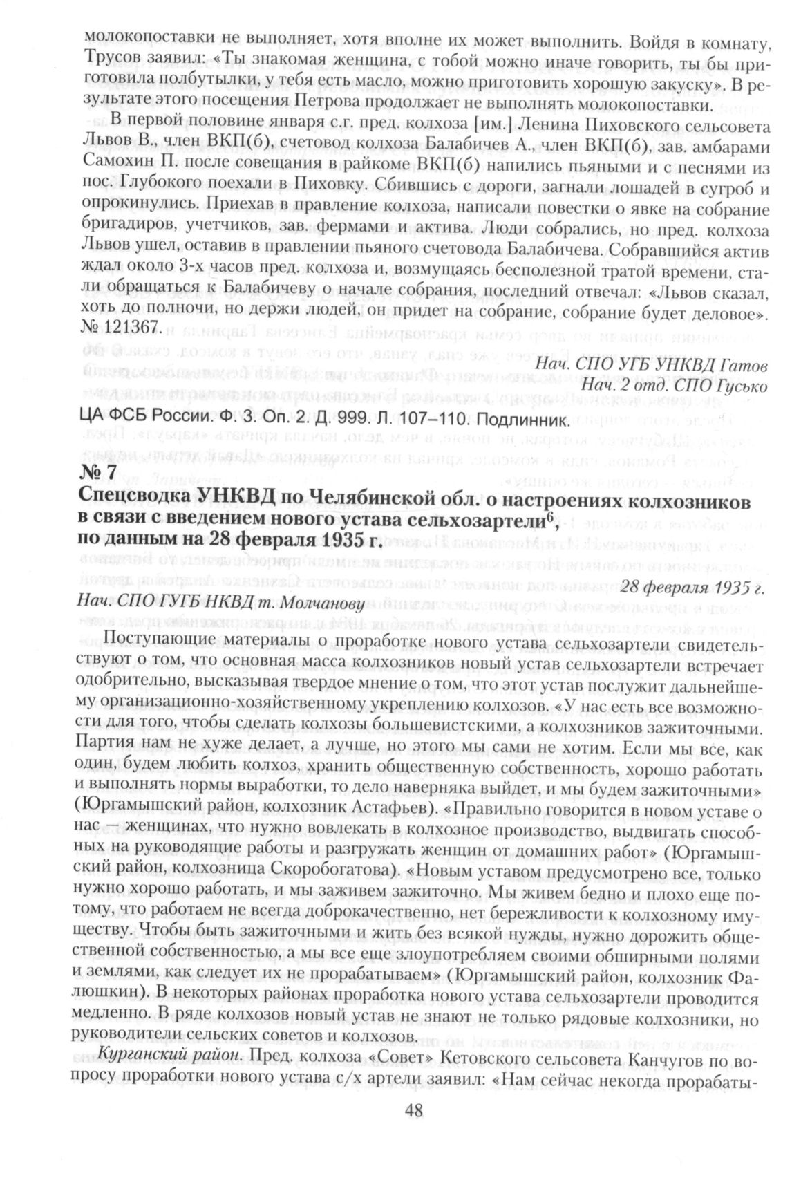 Спецсводка УНКВД по Челябинской обл. о настроениях колхозников в связи с введением нового устава сельхозартели по данным на 28 февраля 1935 г. 28 февраля 1935 г. // ЦА ФСБ России. Ф. 3. Оп. 2. Д. 1085. Л. 38а—43. Подлинник.