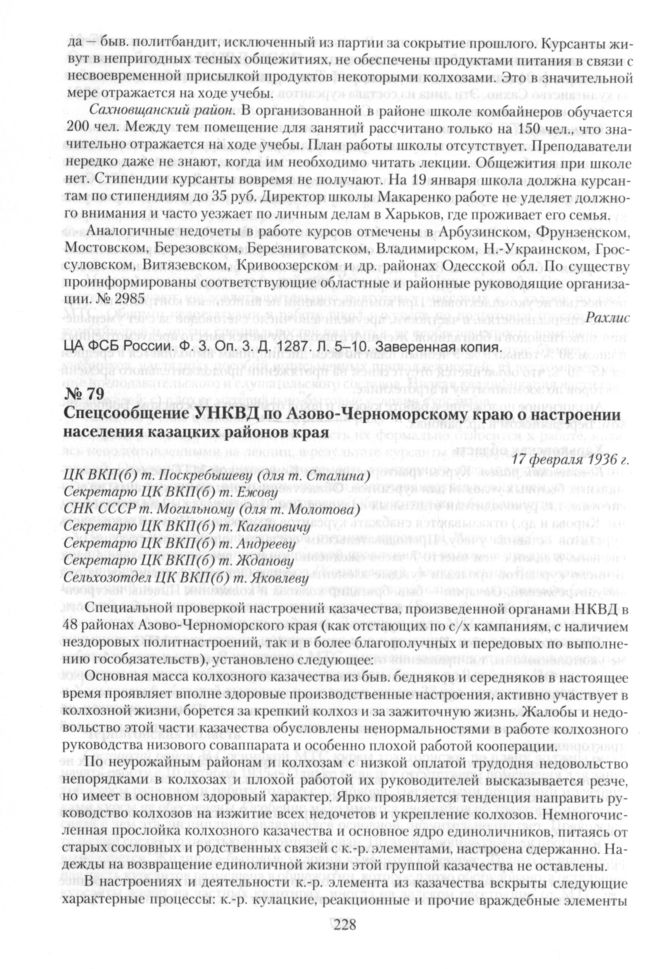 Спецсообщение УНКВД по Азово-Черноморскому краю о настроении населения казацких районов края. 17 февраля 1936 г. // ЦА ФСБ России. Ф. 3. Оп. 3. Д. 60. Л. 187-202. Заверенная копия.