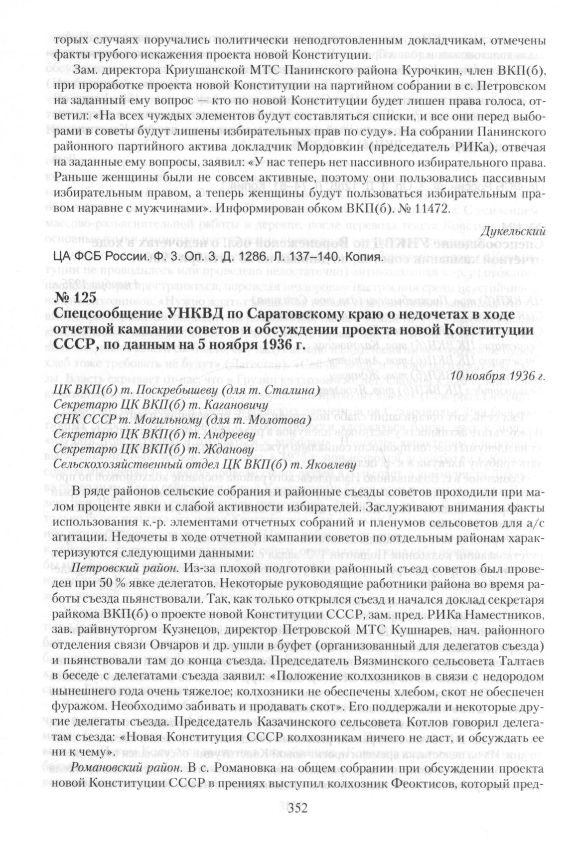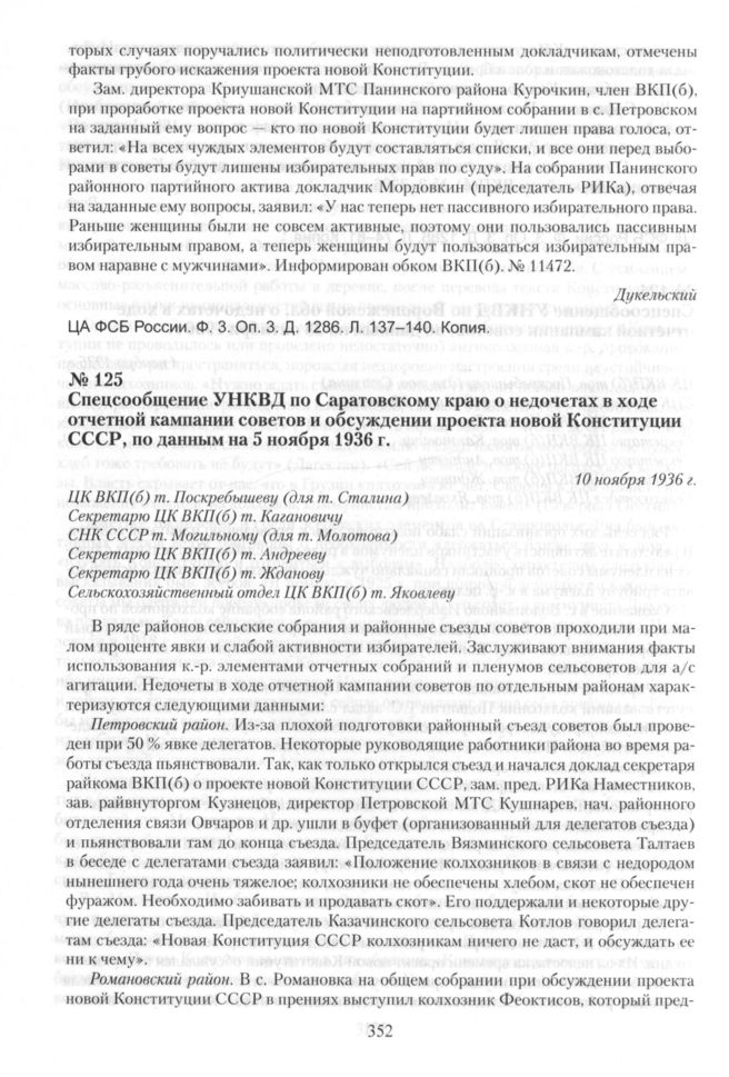 Спецсообщение УНКВД по Саратовскому краю о недочетах в ходе отчетной кампании советов и обсуждении проекта новой Конституции СССР, по данным на 5 ноября 1936 г. 10 ноября 1936 г. // ЦА ФСБ России. Ф. 3. Оп. 3. Д. 1292. Л. 31-34. Заверенная копия.