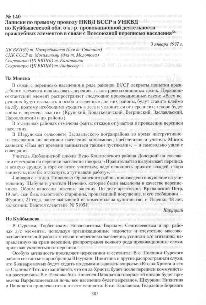 Записки по прямому проводу НКВД БССР и УНКВД по Куйбышевской обл. о к.-р. провокационной деятельности враждебных элементов в связи с Всесоюзной переписью населения. 3 января 1937 г. // ЦА ФСБ России. Ф. 3. Оп. 4. Д. 306. Л. 56-60. Заверенная копия.