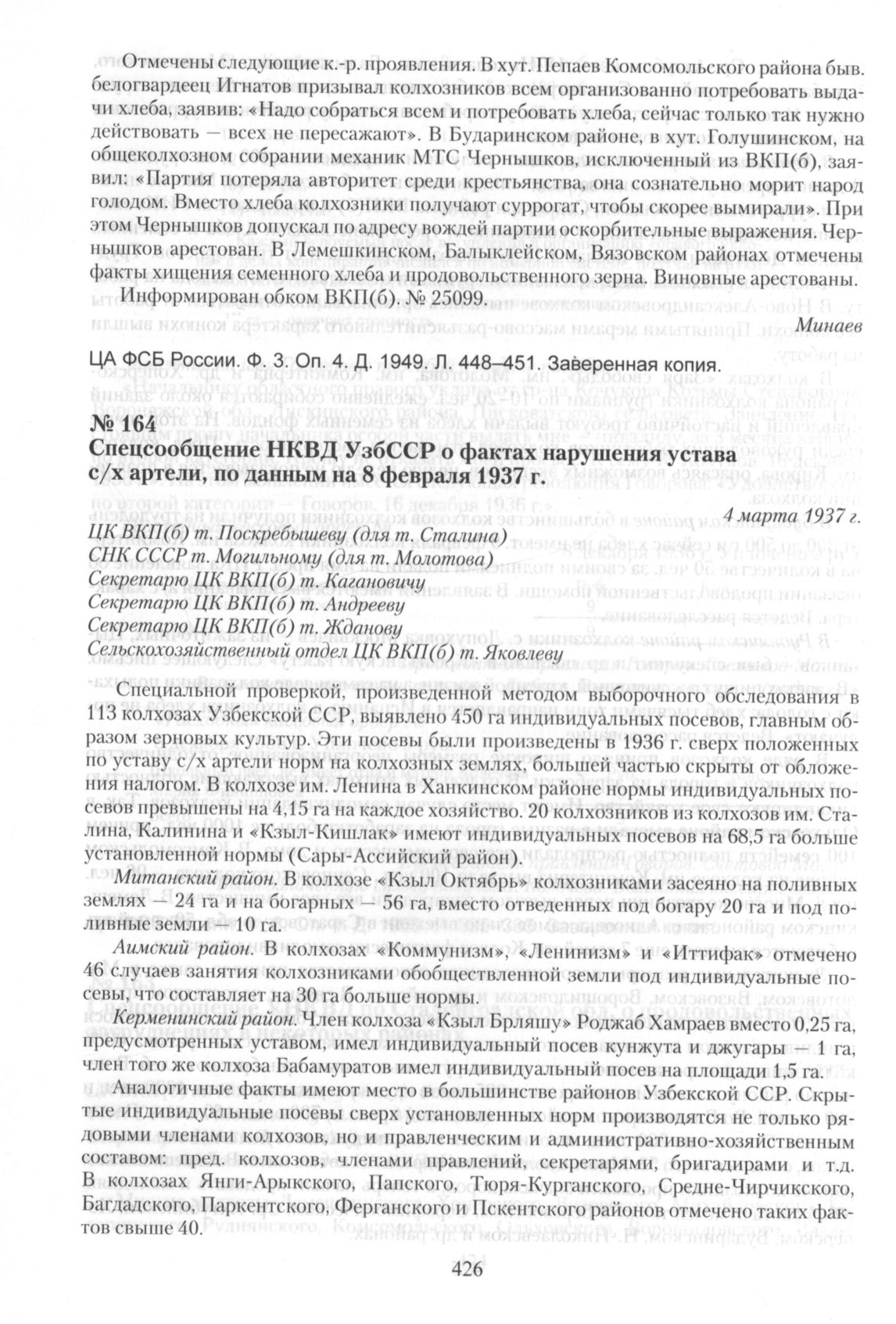 Спецсообщение НКВД УзбССР о фактах нарушения устава с/х артели, по данным на 8 февраля 1937 г. 4 марта 1937 г. // ЦА ФСБ России. Ф. 3. Оп. 4. Д. 1949. Л. 461-465. Заверенная копия.