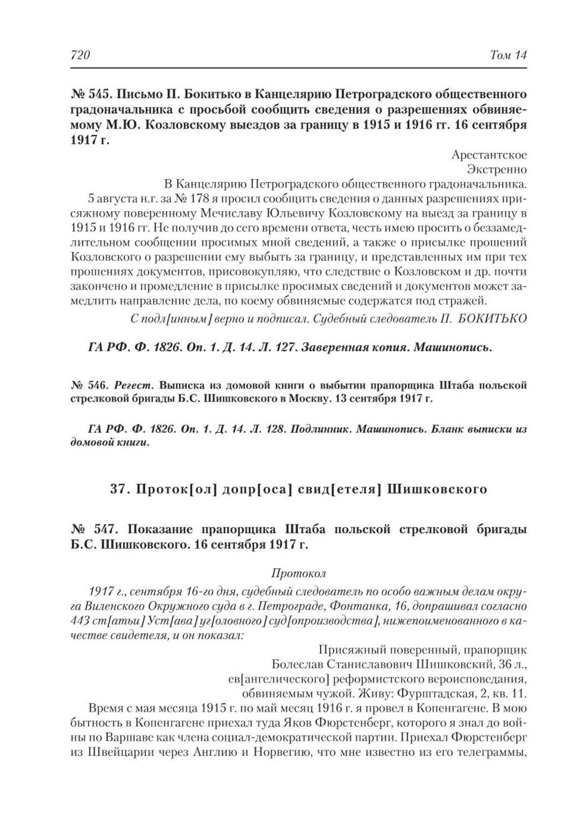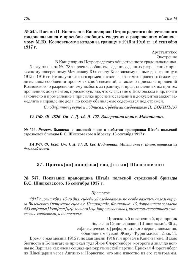 Показание прапорщика штаба польской стрелковой бригады Б.С. Шишковского. 16 сентября 1917 г. : Протокол // ГА РФ. Ф. 1826. Оп. 1. Д. 14. Л. 129–129 об. Автограф.