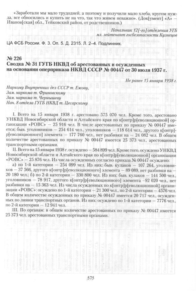 Сводка № 31 ГУГБ НКВД об арестованных и осужденных на основании оперприказа НКВД СССР № 00447 от 30 июля 1937 г. Не ранее 15 января 1938 г. // ЦА ФСБ России. Ф. 3. Оп. 5. Д. 577. Л. 1-4. Подлинник.