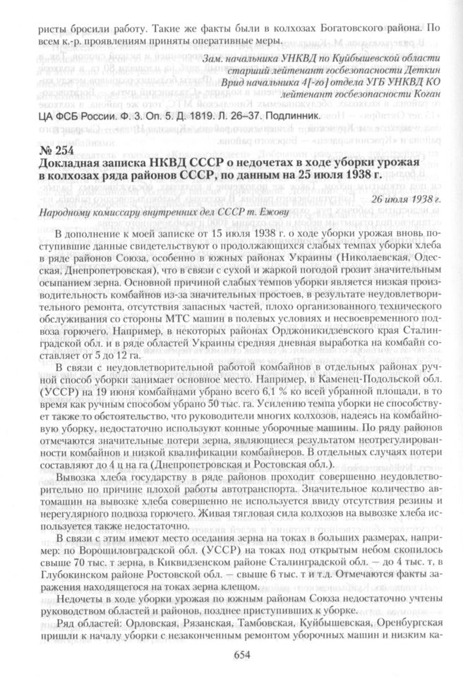 Докладная записка НКВД СССР о недочетах в ходе уборки урожая в колхозах ряда районов СССР, по данным на 25 июля 1938 г. 26 июля 1938 г. // ЦА ФСБ России. Ф. 3. Оп. 5. Д. 1948. Л. 197-217. Копия.