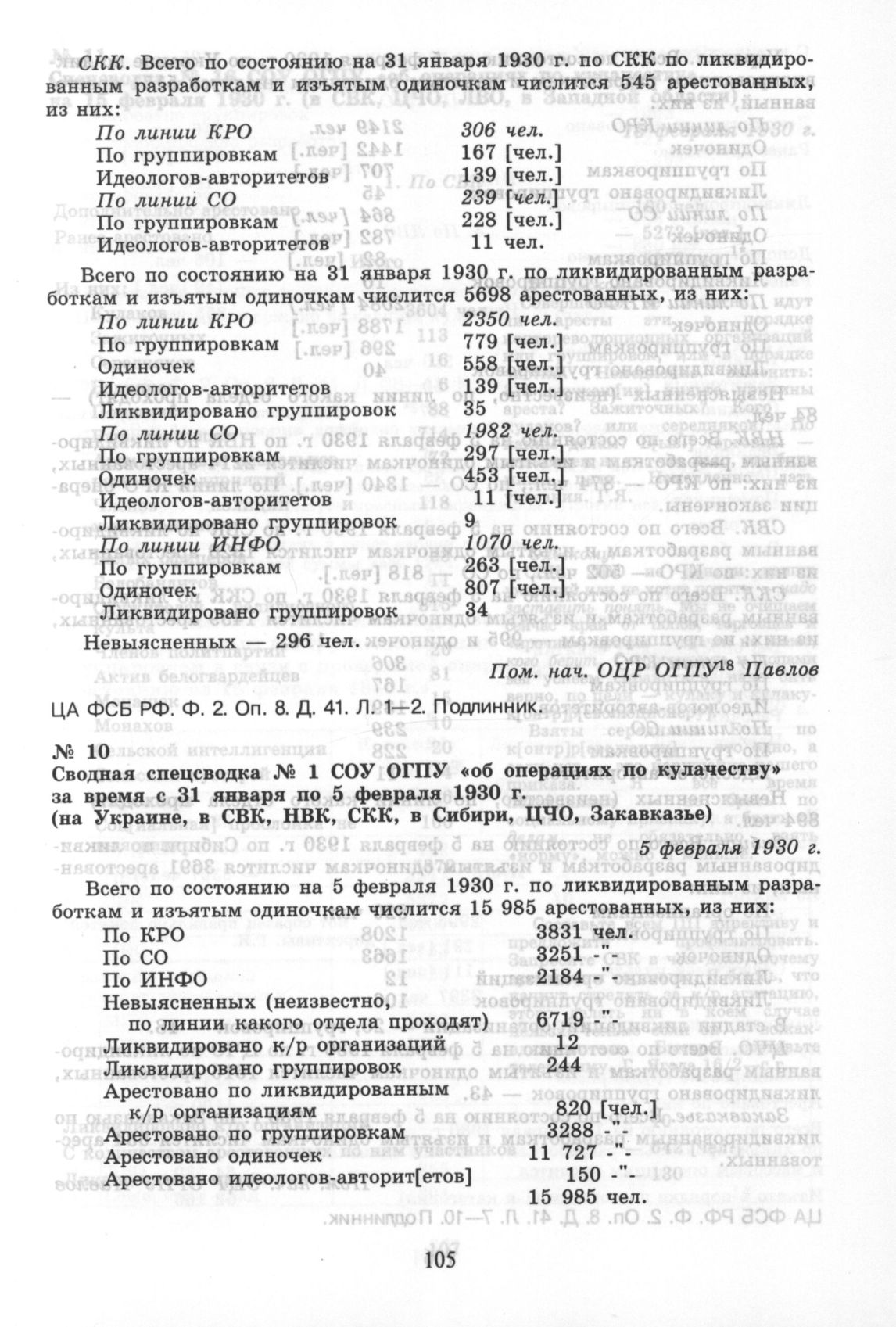 Сводная спецсводка № 1 СОУ ОГПУ «об операциях по кулачеству» за время с 31 января по 5 февраля 1930 г. (на Украине, в СВК, НВК, СКК, в Сибири, ЦЧО, Закавказье). 5 февраля 1930 г. // ЦА ФСБ РФ. Ф. 2. Оп. 8. Д. 41. Л. 7—10. Подлинник.