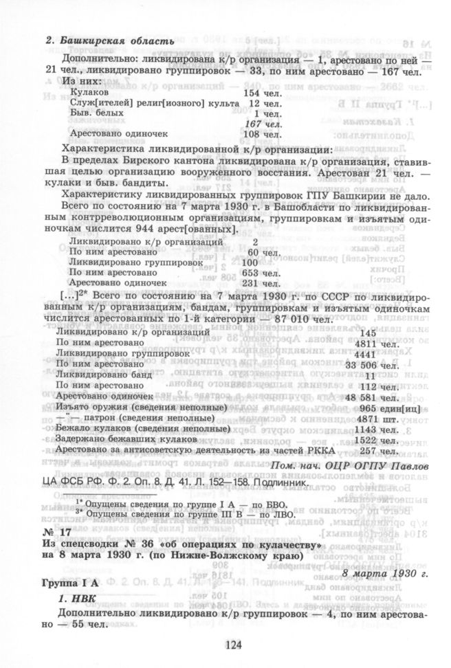 Из спецсводки № 36 «об операциях по кулачеству» на 8 марта 1930 г. (по Нижне-Волжскому краю). 8 марта 1930 г. // ЦА ФСБ РФ. Ф. 2. Оп. 8. Д. 41. Л. 160—162. Подлинник.
