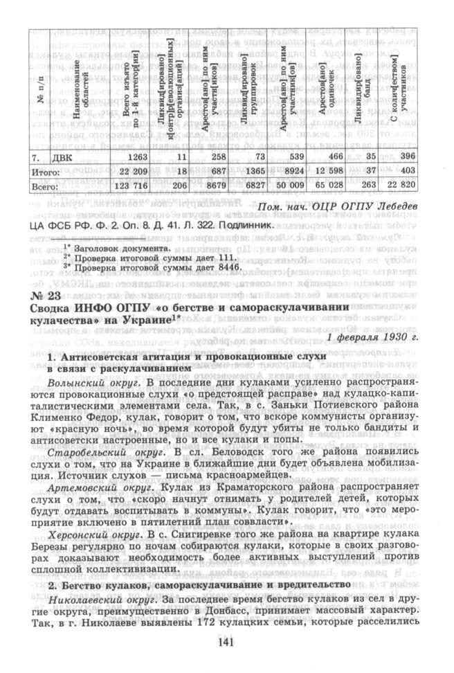 Сводка ИНФО ОГПУ «о бегстве и самораскулачивании кулачества» на Украине. 1 февраля 1930 г.