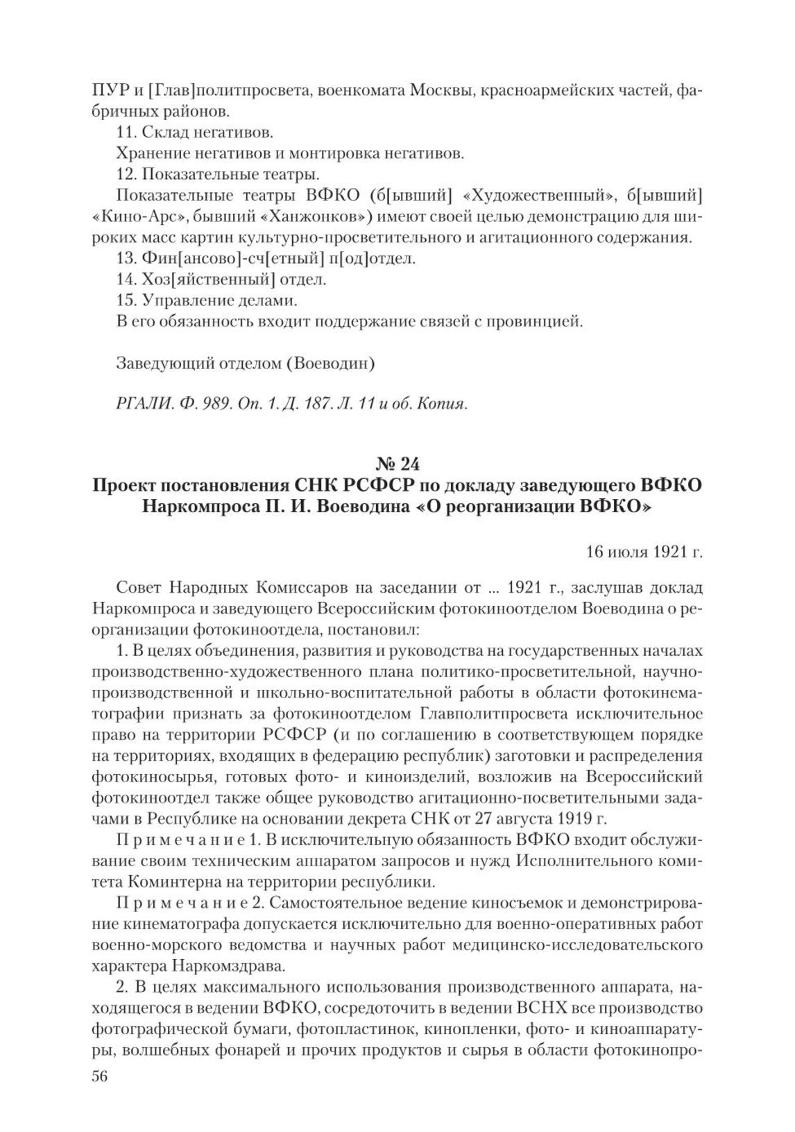 Проект постановления СНК РСФСР по докладу заведующего ВФКО Наркомпроса П. И. Воеводина «О реорганизации ВФКО». 16 июля 1921 г. // РГАЛИ. Ф. 989. Оп. 1. Д. 240. Л. 19–20. Подлинник.