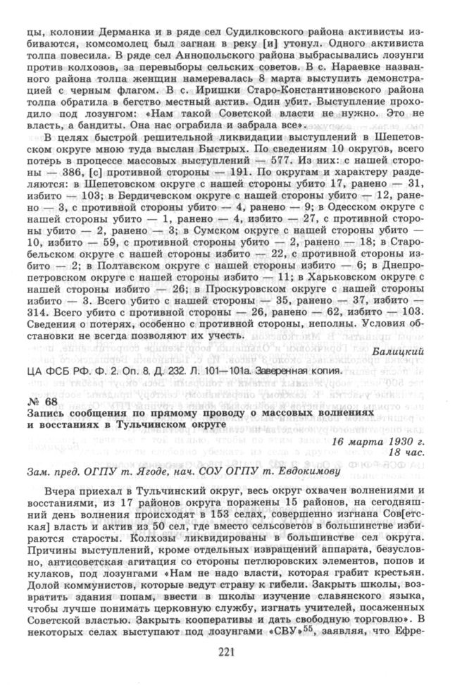 Запись сообщения ГПУ Украины руководству ОГПУ по прямому проводу о массовых волнениях и восстаниях в Тульчинском округе. 16 марта 1930 г. // ЦА ФСБ РФ. Ф. 2. Оп. 8. Д. 232. Л. 115—115об. Заверенная копия.