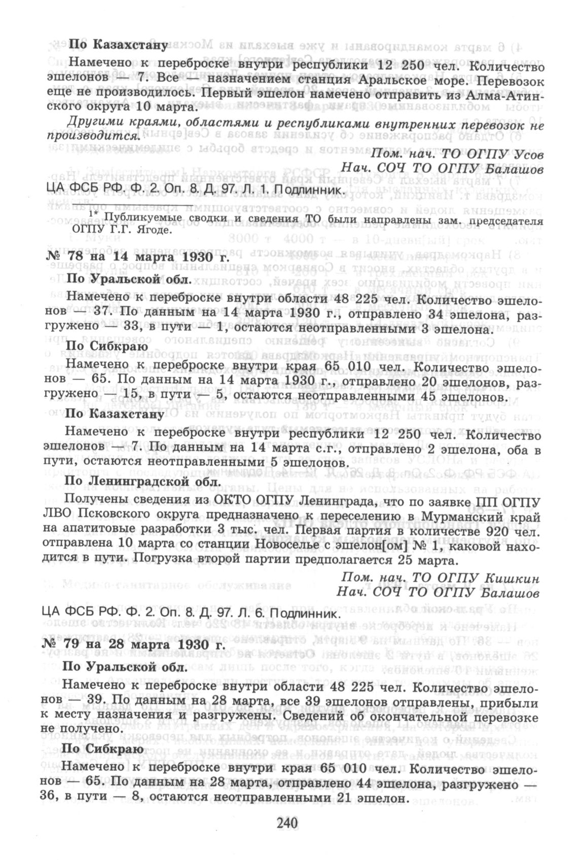 Сводка Транспортного отдела ОГПУ «по внутренним перевозкам кулаков» на 14 марта 1930 г. // ЦА ФСБ РФ. Ф. 2. Оп. 8. Д. 97. Л. 6. Подлинник.