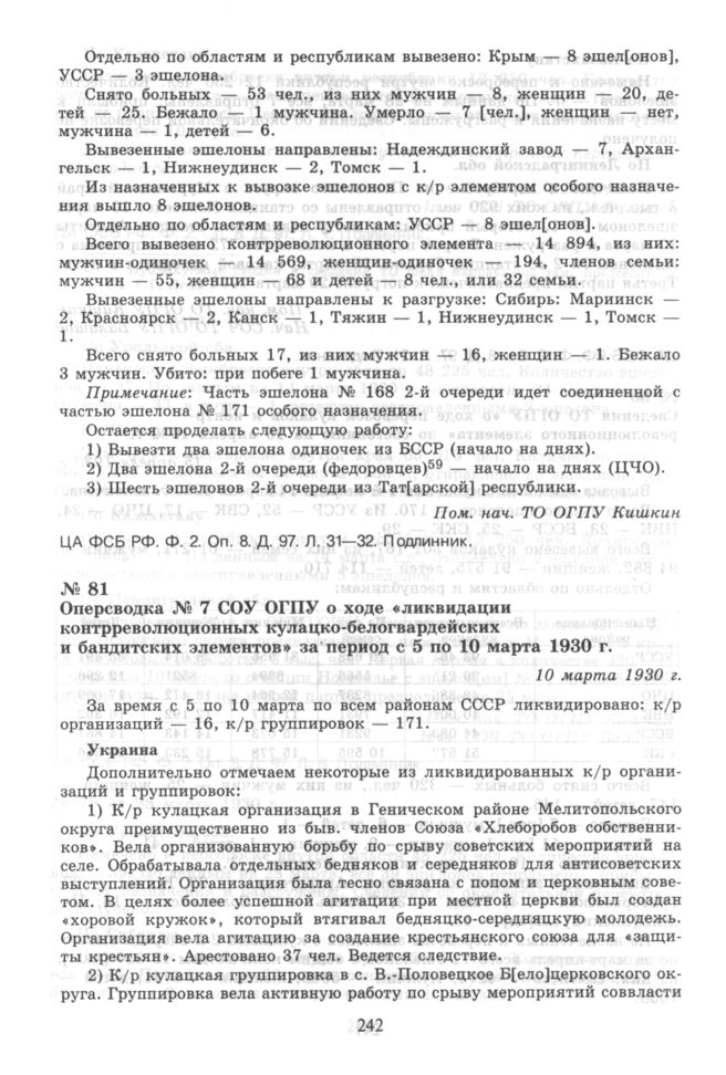 Оперсводка № 7 СОУ ОГПУ о ходе «ликвидации контрреволюционных кулацко-белогвардейских и бандитских элементов» за период с 5 по 10 марта 1930 г. 10 марта 1930 г. // ЦА ФСБ РФ. Ф. 2. Оп. 8. Д. 23. Л. 122-134. Копия.