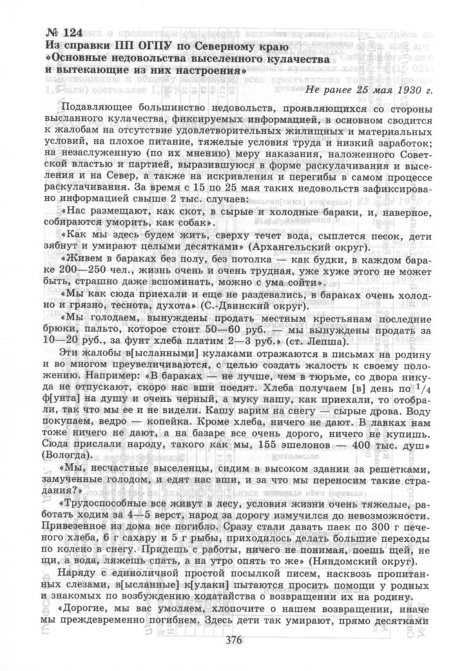 Из справки ПП ОГПУ по Северному краю «Основные недовольства выселенного кулачества и вытекающие из них настроения». Не ранее 25 мая 1930 г. // ЦА ФСБ РФ. Ф. 2. Оп. 8. Д. 204. Л. 368—386. Подлинник.