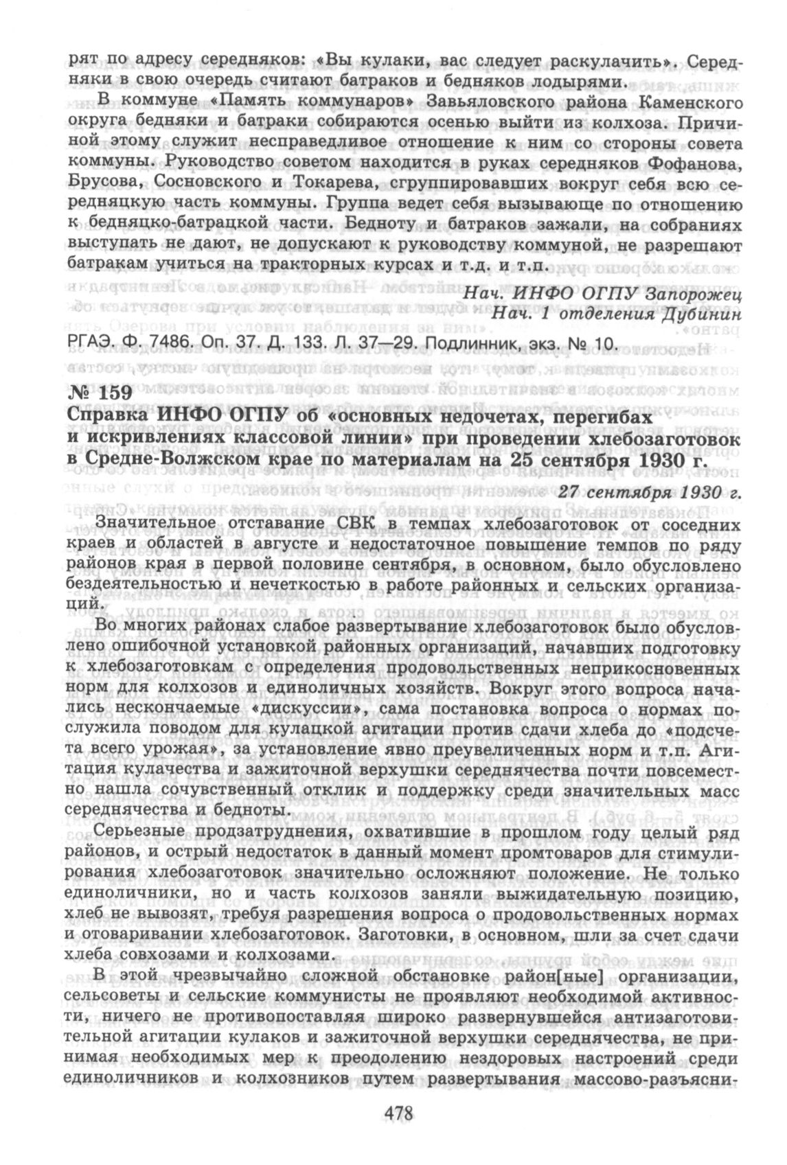 Справка ИНФО ОГПУ об «основных недочетах, перегибах и искривлениях классовой линии» при проведении хлебозаготовок в Средне-Волжском крае по материалам на 25 сентября 1930 г. 27 сентября 1930 г.