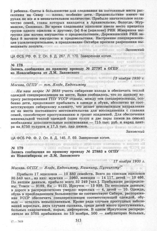 Запись сообщения по прямому проводу № 27797 в ОГПУ из Новосибирска от Л.М. Заковского. 13 ноября 1930 г. // ЦА ФСБ РФ. Ф. 2. Оп. 8. Д. 145. Л. 69. Заверенная копия.