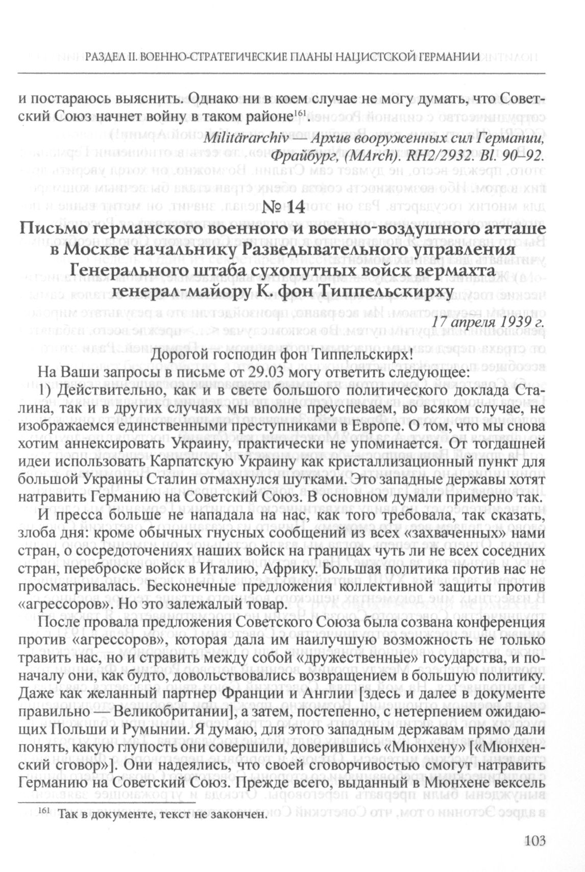Письмо германского военного и военно-воздушного атташе в Москве начальнику Разведывательного управления Генерального штаба сухопутных войск вермахта генерал-майору К. фон Типпельскирху (17 апреля 1939 г.) // MArch RH2/2932. Bl. 101-105.