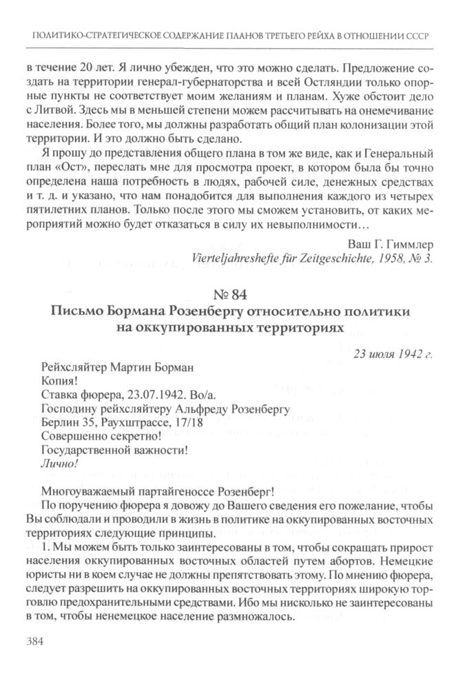 Письмо Бормана Розенбергу относительно политики на оккупированных территориях (23 июля 1942 г.) // «Военно-исторический журнал». 1965. № 1. С. 82-83.
