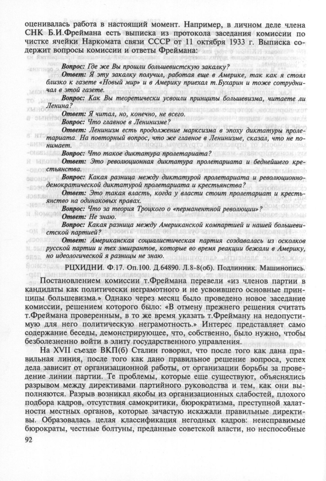 Выписка из протокола заседания комиссии по чистке ячейки Наркомата связи СССР от 11 октября 1933 г., содержащая вопросы комиссии и ответы члена СНК Б.И.Фреймана // РЦХИДНИ. Ф.17. Оп.100. Д.64890. Л.8-8(об). Подлинник. Машинопись.
