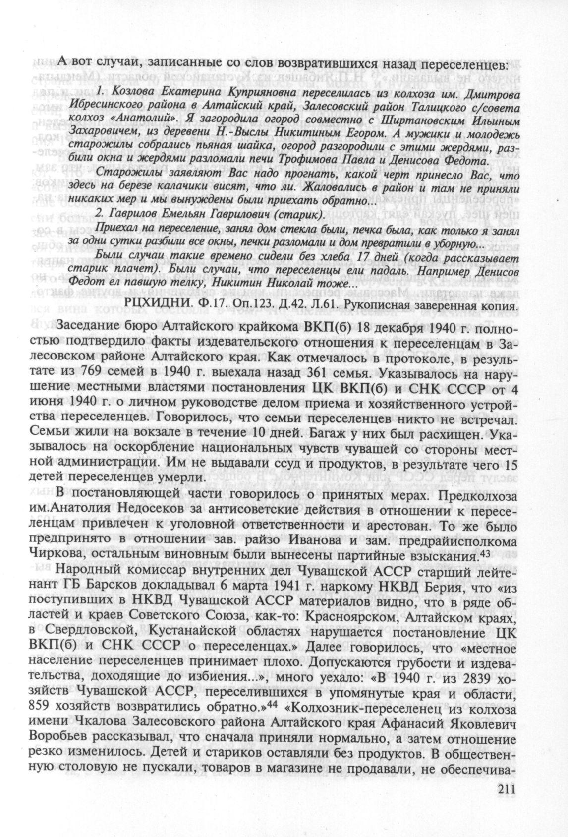 Случаи, записанные со слов возвратившихся назад переселенцев // РЦХИДНИ. Ф.17. Оп.123. Д.42. Л.61. Рукописная заверенная копия.