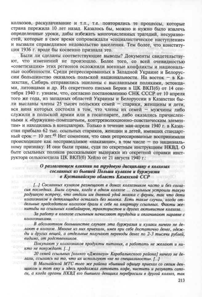 Секретная справка инструктора сельхозотдела ЦК ВКП(б) Хейло от 21 августа 1940 г. «О разлагающем влиянии на трудовую дисциплину в колхозах сосланных из бывшей Польши кулаков и буржуазии в Кустанайскую область Казахской ССР» // РЦХИДНИ. Ф.17. Оп.123. Д.42. Л.7-8. Заверенная машинописная копия.