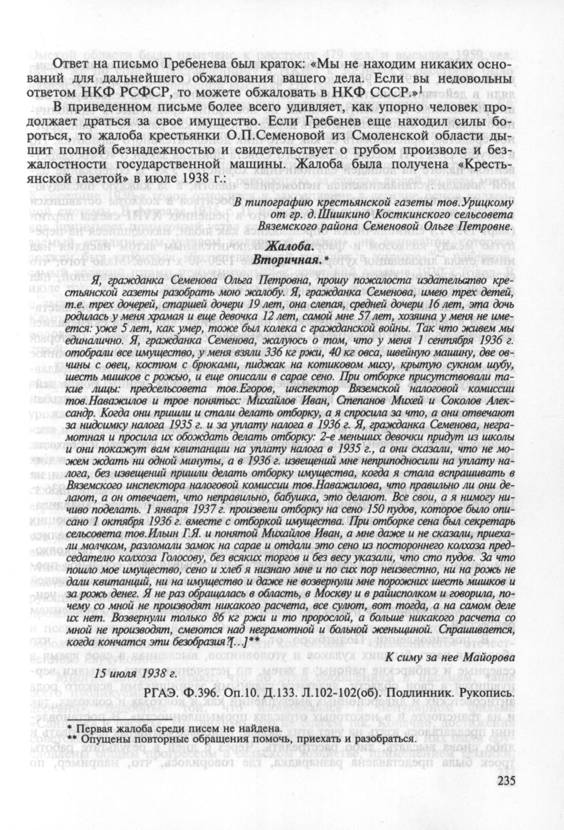 Жалоба крестьянки О.П.Семеновой из Смоленской области, полученная «Крестьянской газетой». 15 июля 1938 г.