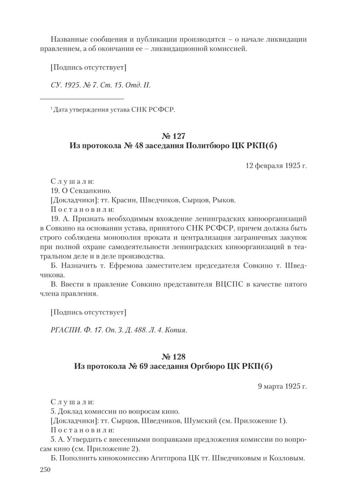 Из протокола № 69 заседания Оргбюро ЦК РКП(б). 9 марта 1925 г. // РГАСПИ. Ф. 17. Оп. 112. Д. 645. Л. 3. Копия; Л. 153–161. Подлинник; Л. 6. Копия.
