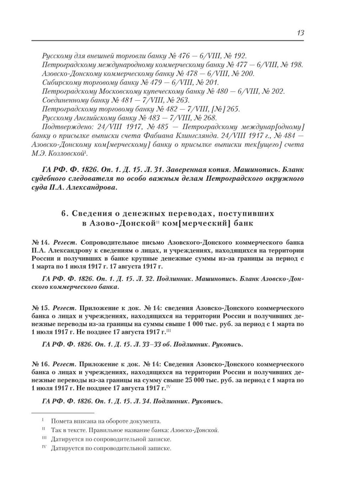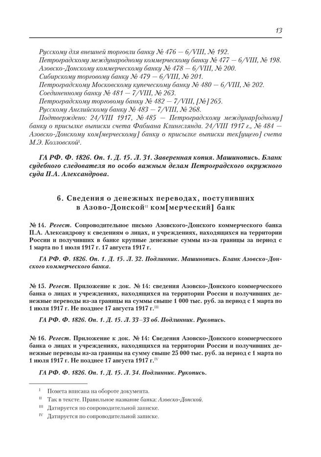 Регест. Приложение к док. № 14: сведения Азовско-Донского коммерческого банка о лицах и учреждениях, находящихся на территории России и получивших денежные переводы из-за границы на суммы свыше 1 000 тыс. руб. за период с 1 марта по 1 июля 1917 г. Не позднее 17 августа 1917 г. // ГА РФ. Ф. 1826. Оп. 1. Д. 15. Л. 33–33 об. Подлинник. Рукопись.