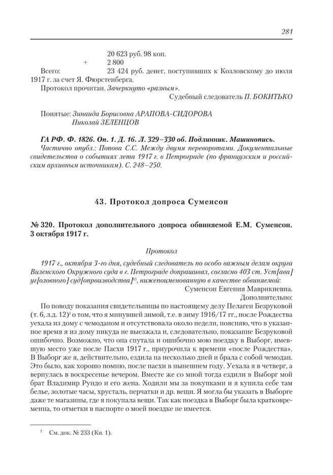 Протокол дополнительного допроса обвиняемой Е.М. Суменсон. 3 октября 1917 г. : Протокол // ГА РФ. Ф.1826. Оп. 1. Д. 16. Л. 331. Подлинник. Рукопись.