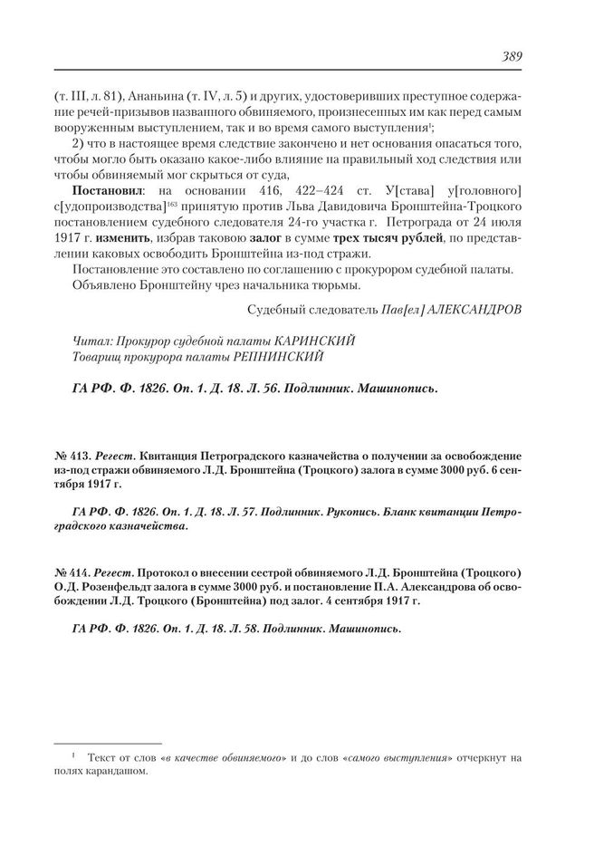 Регест. Протокол о внесении сестрой обвиняемого Л.Д. Бронштейна (Троцкого) О.Д. Розенфельдт залога в сумме 3 000 руб. и постановление П.А. Александрова об освобождении Л.Д. Бронштейна (Троцкого) под залог 4 сентября 1917 г. // ГА РФ. Ф. 1826. Оп. 1. Д. 18. Л. 58. Подлинник. Машинопись.