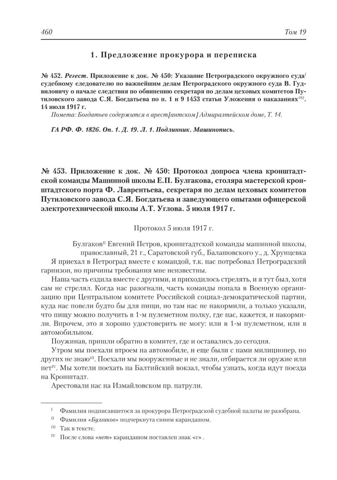 Приложение к док. № 450: Протокол допроса члена кронштадтской команды Машинной школы Е.П. Булгакова, столяра мастерской кронштадтского порта Ф. Лаврентьева, секретаря по делам цеховых комитетов Путиловского завода С.Я. Богдатьева и заведующего опытами офицерской электротехнической школы А.Т. Углова. 5 июля 1917 г.
