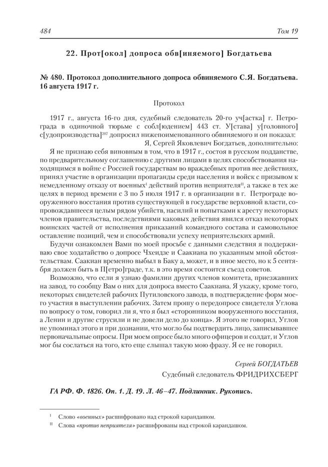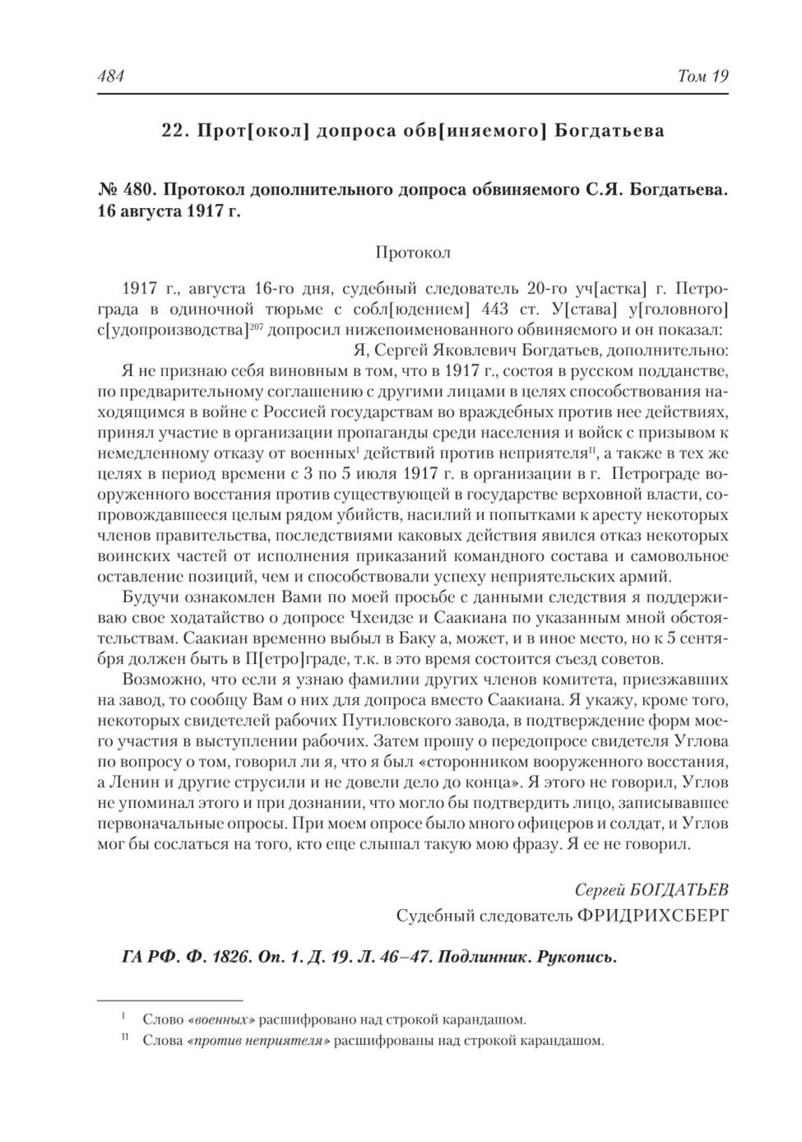 Главная Политические партии и движения Следственное дело большевиков : Материалы Предварительного следстви... Следственное дело большевиков. Сборник документов в 2-х книгах. Кни... Документы Протокол дополнительного допроса обвиняемого С.Я. Богдатьева. 16 ав...