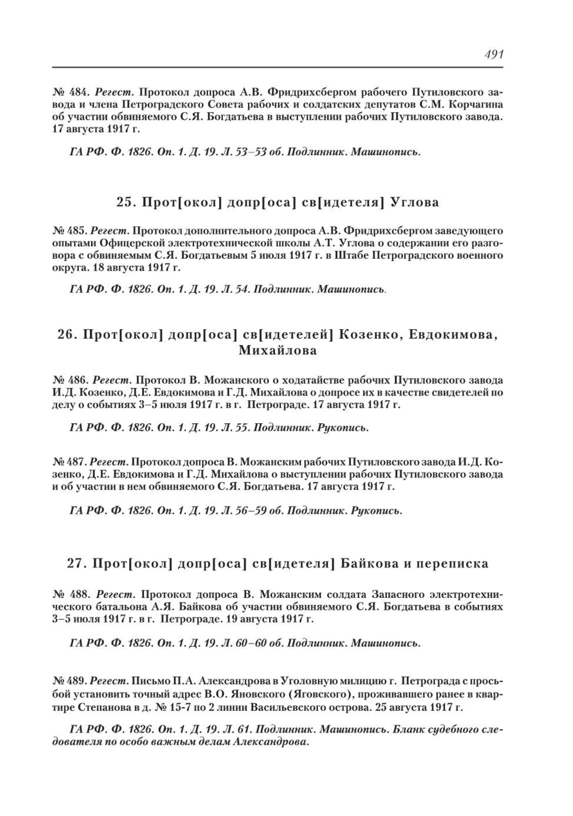 Регест. Письмо П.А. Александрова в Уголовную милицию г. Петрограда с просьбой установить точный адрес В.О. Яновского (Яговского), проживавшего ранее в квартире Степанова в д. № 15-7 по 2 линии Васильевского острова. 25 августа 1917 г. // ГА РФ. Ф. 1826. Оп. 1. Д. 19. Л. 61. Подлинник. Машинопись. Бланк судебного следователя по особо важным делам Александрова.