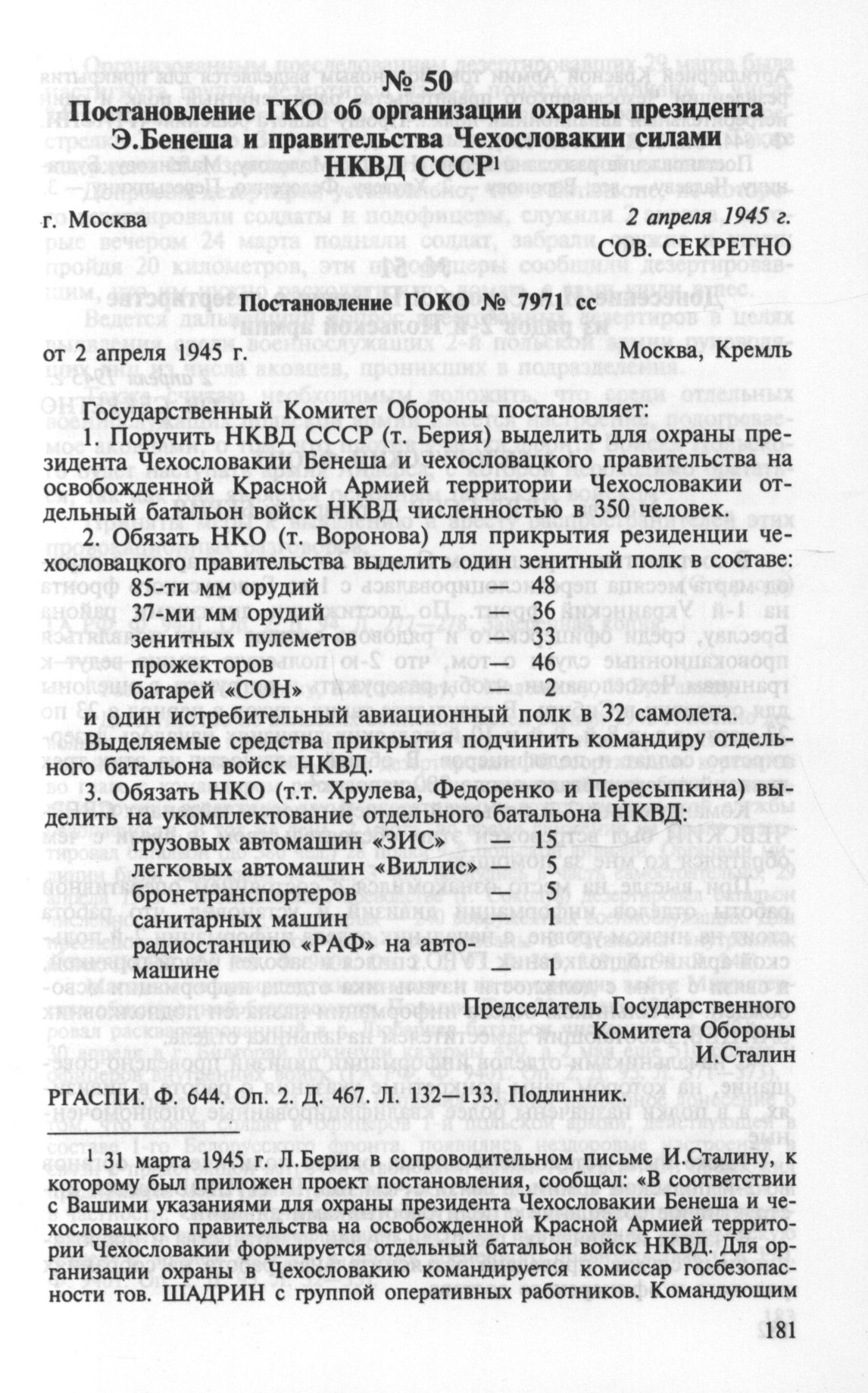 Постановление ГКО об организации охраны Президента Э.Бенеша и правительства Чехословакии силами НКВД СССР. Москва, 2 апреля 1945 г. // РГАСПИ. Ф. 644. Оп. 2. Д. 467. Л. 132—133. Подлинник.