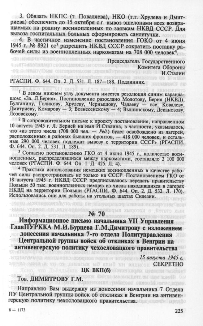 Информационное письмо начальника VII Управления ГлавПУРККА М.И.Бурцева Г.М.Димитрову с изложением донесения начальника 7-го отдела Политуправления Центральной группы войск об откликах в Венгрии на антивенгерскую политику чехословацкого правительства. 15 августа 1945 г. // РГАСПИ. Ф. 17. Оп. 128. Д. 32. Л. 69-72. Подлинник.