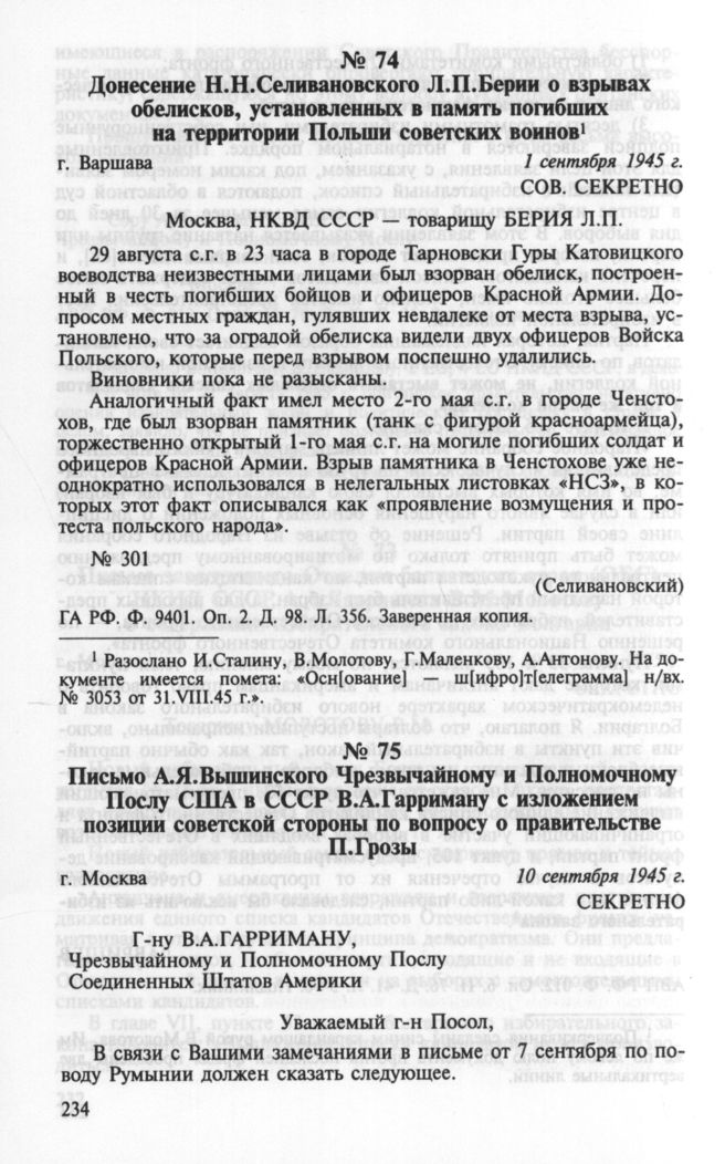 Донесение Н.Н.Селивановского Л.П.Берии о взрывах обелисков, установленных в память погибших на территории Польши советских воинов. Варшава, 1 сентября 1945 г. // ГА РФ. Ф. 9401. Оп. 2. Д. 98. Л. 356. Заверенная копия.