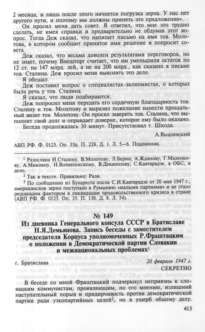 Из дневника Генерального консула СССР в Братиславе Н.Я.Демьянова. Запись беседы с заместителем председателя Корпуса уполномоченных Р.Фраштацким о положении в Демократической партии Словакии и межнациональных проблемах. Братислава, 20 февраля 1947 г. // АВП РФ. Ф. 0138. Оп. 28. П. 141. Д. 11. Л. 26—27. Подлинник.