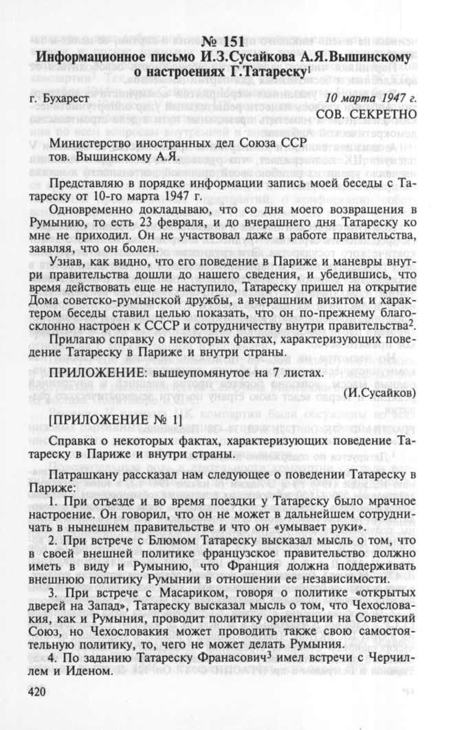 Информационное письмо И.З.Сусайкова А.Я.Вышинскому о настроениях Г.Татареску. Бухарест, 10 марта 1947 г. // АВП РФ. Ф. 0125. Оп. 35. П. 137. Д. 16. Л. 4—11. Заверенная копия.