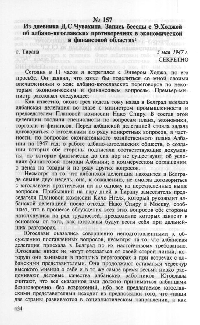 Из дневника Д.С.Чувахина. Запись беседы с Э.Ходжей об албано-югославских противоречиях в экономической и финансовой областях. Тирана, 3 мая 1947 г. // АВП РФ. Ф.067. Оп. 15. П. 106. Д. 8. Л. 49—54. Подлинник.