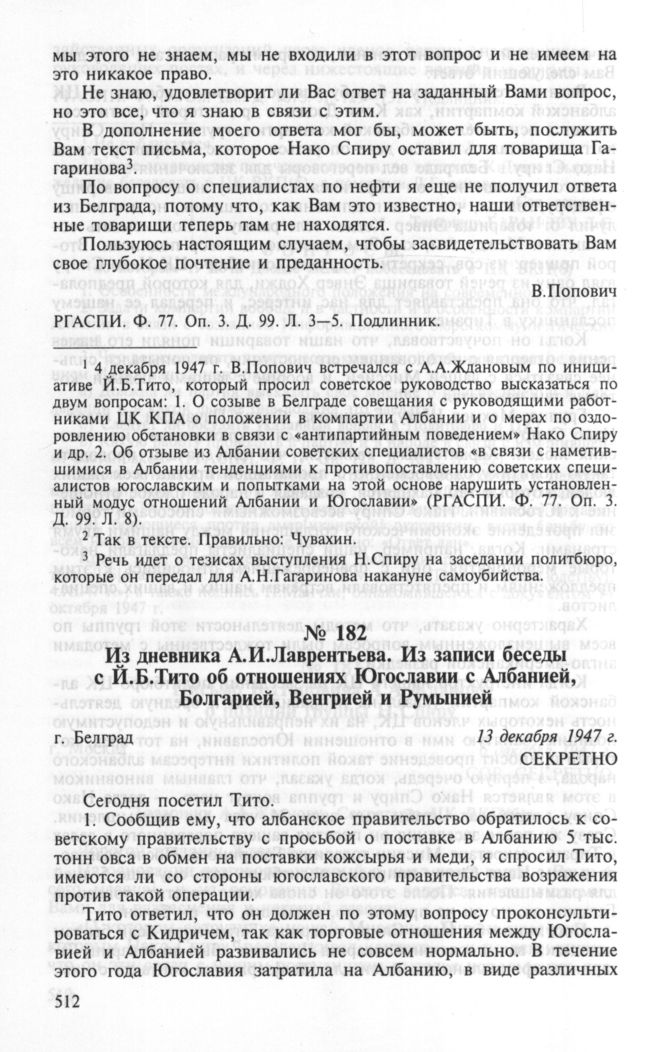 Из дневника А.И.Лаврентьева. Из записи беседы с Й.Б.Тито об отношениях Югославии с Албанией, Болгарией, Венгрией и Румынией. Белград, 13 декабря 1947 г. // АВП РФ. Ф. 06. Оп. 9. П. 82. Д. 1285. Л. 173-174. Подлинник.