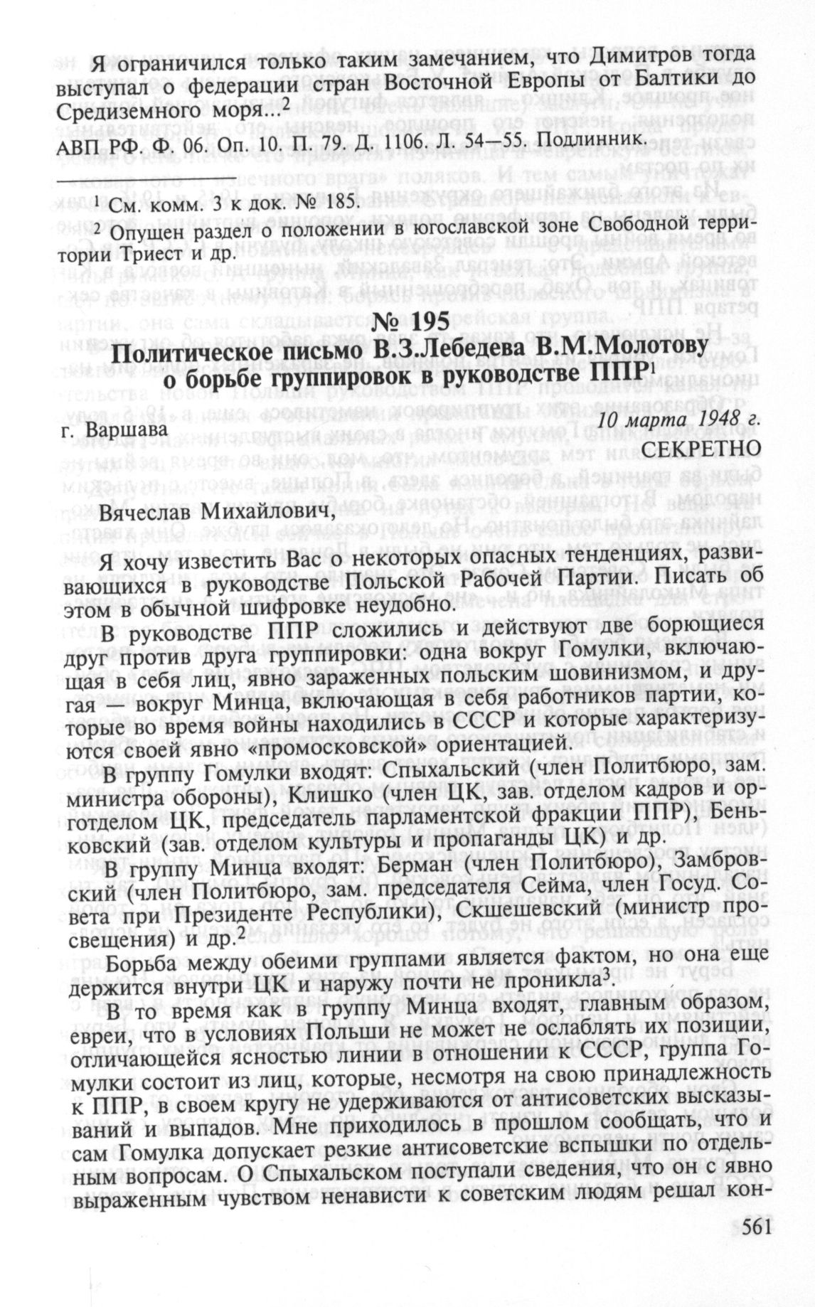 Политическое письмо В.З.Лебедева В.М.Молотову о борьбе группировок в руководстве ППР. Варшава, 10 марта 1948 г. // РГАСПИ. Ф. 82. Оп. 2. Д. 1301. Л. 4—8. Подлинник.