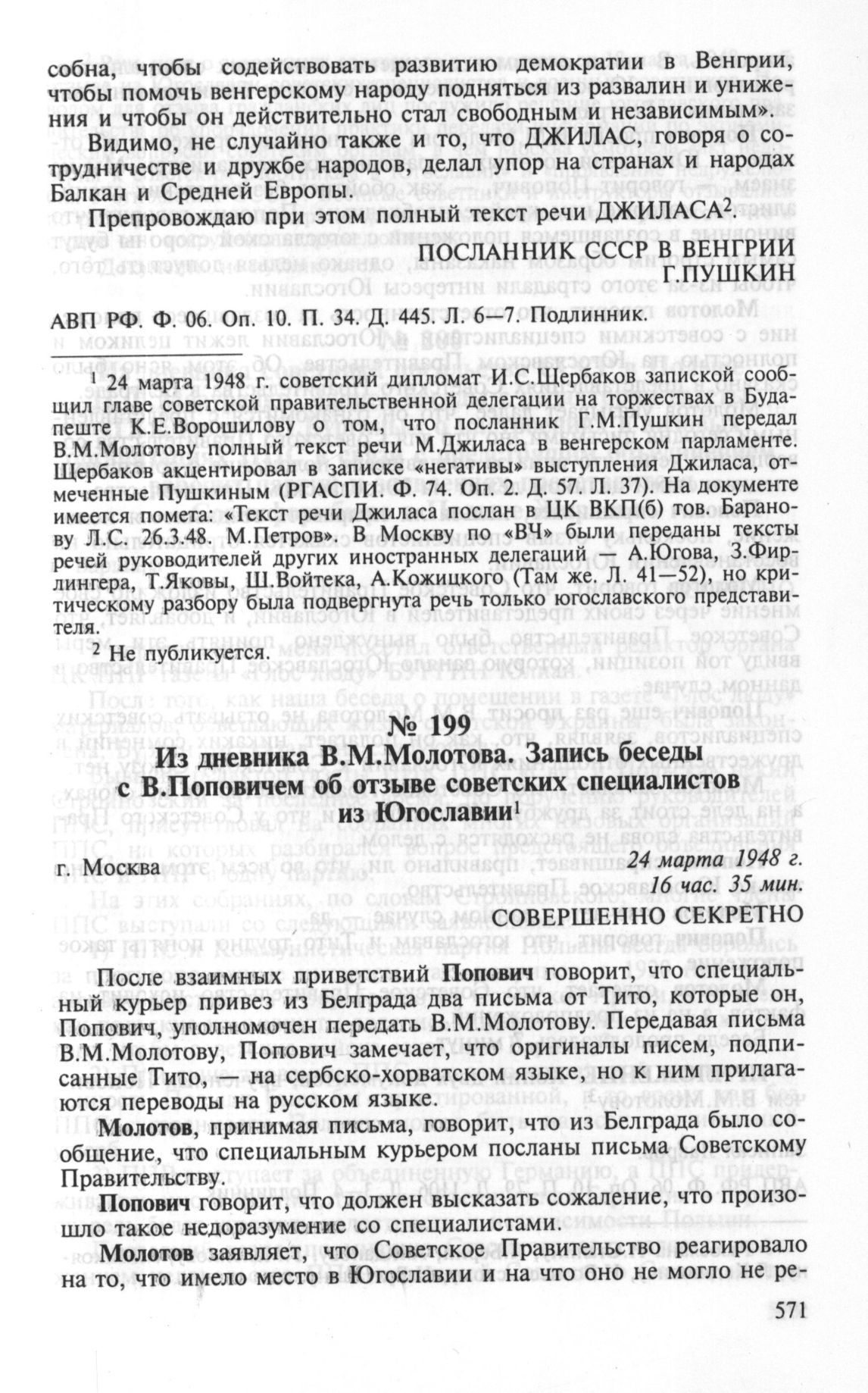 Из дневника В.М.Молотова. Запись беседы с B.Поповичем об отзыве советских специалистов из Югославии. Белград, 24 марта 1948 г. // АВП РФ. Ф. 06. Оп. 10. П. 79. Д. 1106. Л. 3—4. Подлинник.