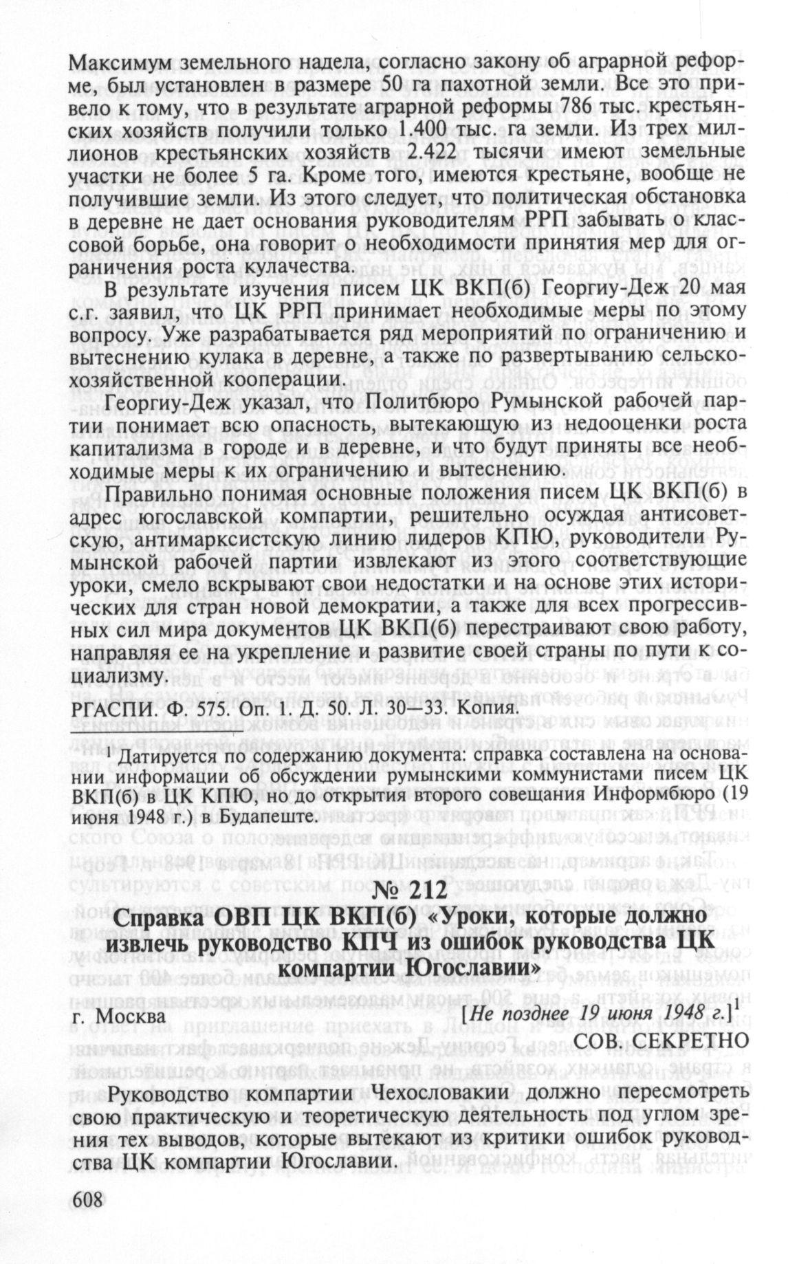 Справка ОВП ЦК ВКП(б) «Уроки, которые должно извлечь руководство КПЧ из ошибок руководства ЦК компартии Югославии». Москва, не позднее 19 июня 1948 г. // РГАСПИ. Ф. 575. Oп. 1. Д. 50. Л. 44-55. Копия.