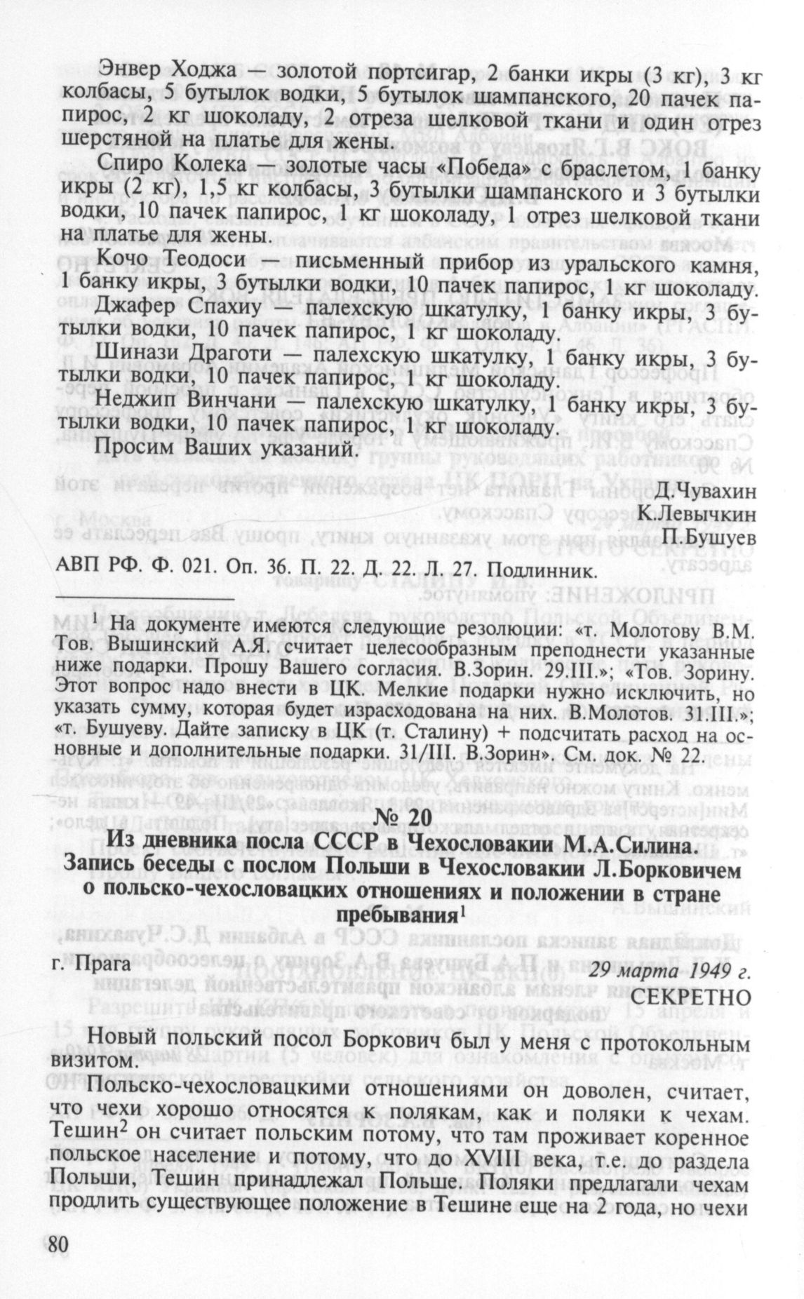 Из дневника посла СССР в Чехословакии М.А.Силина. Запись беседы с послом Польши в Чехословакии Л. Берковичем о польско-чехословацких отношениях и положении в стране пребывания. Прага, 29 марта 1949 г. // АВП РФ. Ф. 21. Оп. 3. П. 12. Д. 264. Л. 1—2. Подлинник.