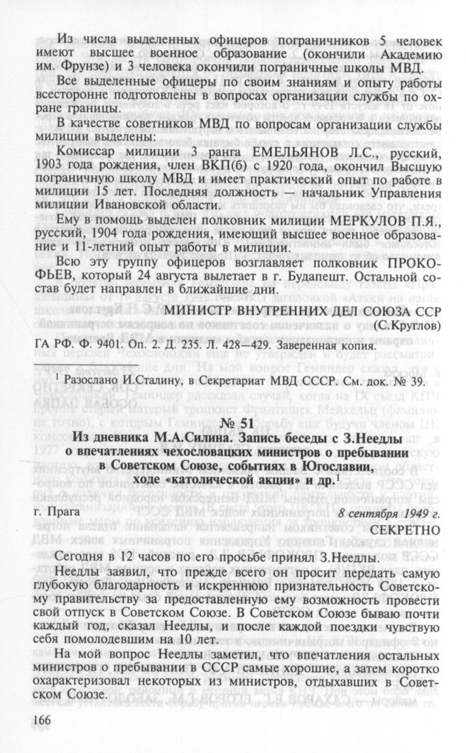 Из дневника М.А.Силина. Запись беседы с З.Неедлы о впечатлениях чехословацких министров о пребывании в Советском Союзе, событиях в Югославии, ходе «католической акции» и др, Прага, 8 сентября 1949 г. // АВП РФ. Ф. 07. Оп. 22. П. 41. Д. 350. Л. 34-37. Копия.