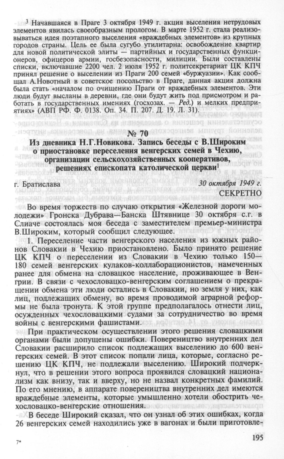 Из дневника Н.Г.Новикова. Запись беседы с В.Широким о приостановке переселения венгерских семей в Чехию, организации сельскохозяйственных кооперативов, решениях епископата католической церкви. Братислава 30 октября 1949 г.