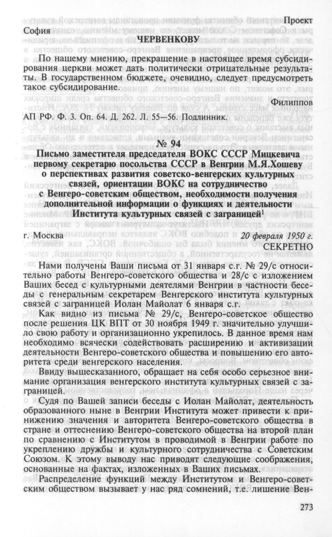 Письмо заместителя председателя ВОКС СССР Мицкевича первому секретарю посольства СССР в Венгрии М.Я.Хошеву о перспективах развития советско-венгерских культурных связей, ориентации ВОКС на сотрудничество с Венгеро-советским обществом, необходимости получения дополнительной информации о функциях и деятельности Института культурных связей с заграницей. Москва, 20 февраля 1950 г. // ГА РФ. Ф. 5283. Оп. 22. Д. 242. Л. 114-115. Копия.